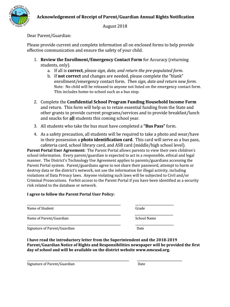 Acknowledgement of Receipt of Parent/Guardian Annual Rights Notification August 2018Dear Parent/Guardian:Please provide current and complete information all on enclosed forms to help provide effective