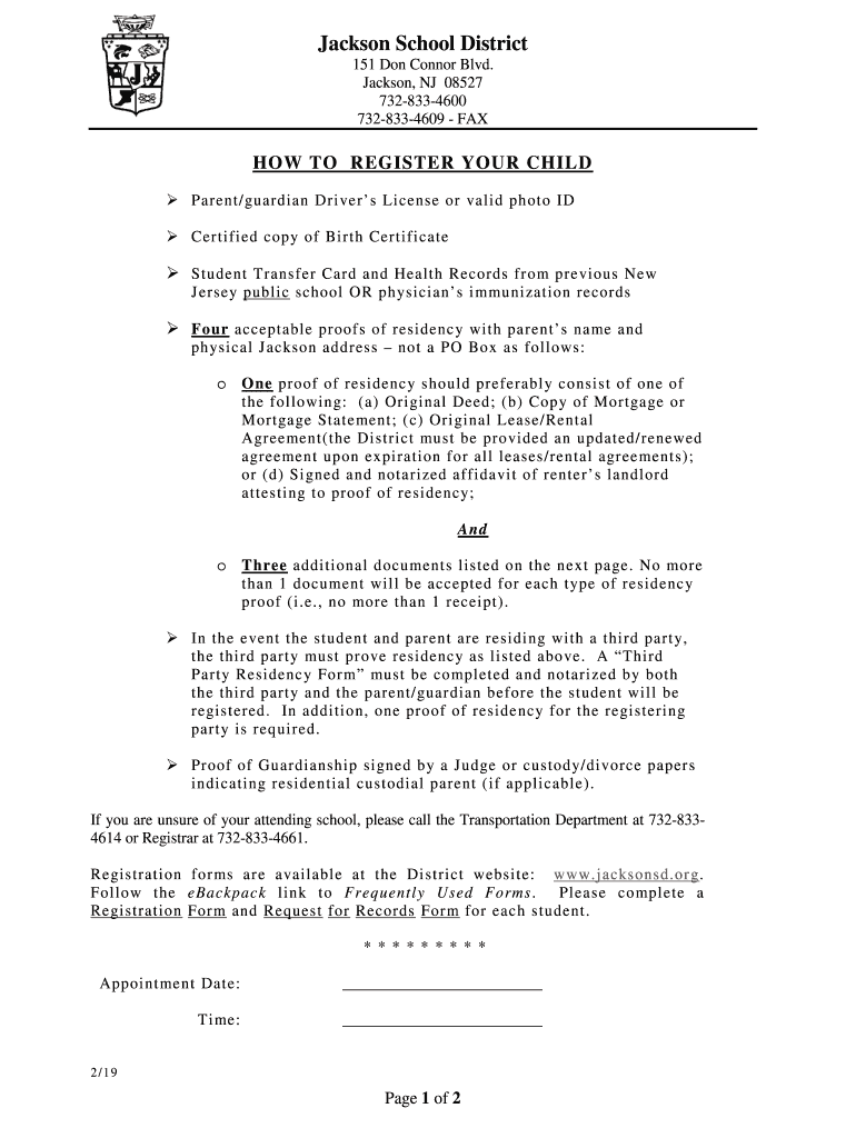 Jackson School District 151 Don Connor Blvd. Jackson, NJ 08527 7328334600 7328334609 FALLOW TO REGISTER YOUR CHILD Parent/guardian Driver's License or valid photo ID Certified copy of Birth Certificate
