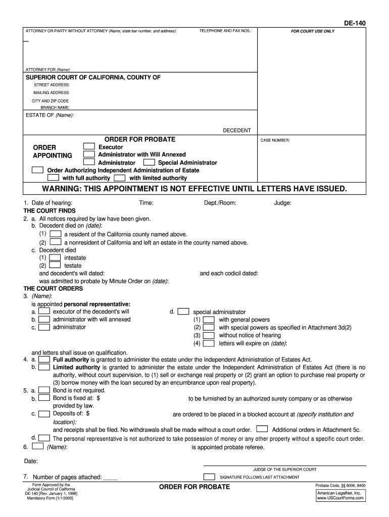 The California Order for Probate (DE-140) is a legal document used by courts to appoint a personal representative for a decedent's estate.