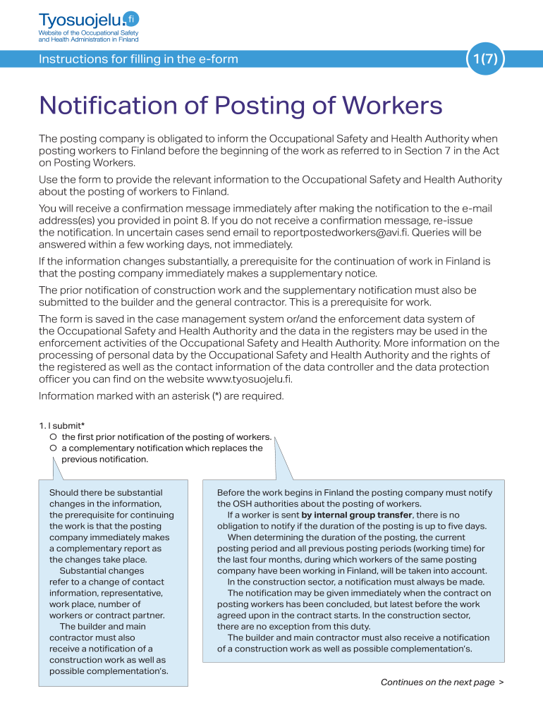 1(7)Instructions for filling in the eformNotification of Posting of Workers posting company is obligated to inform the Occupational Safety and Health Authority when