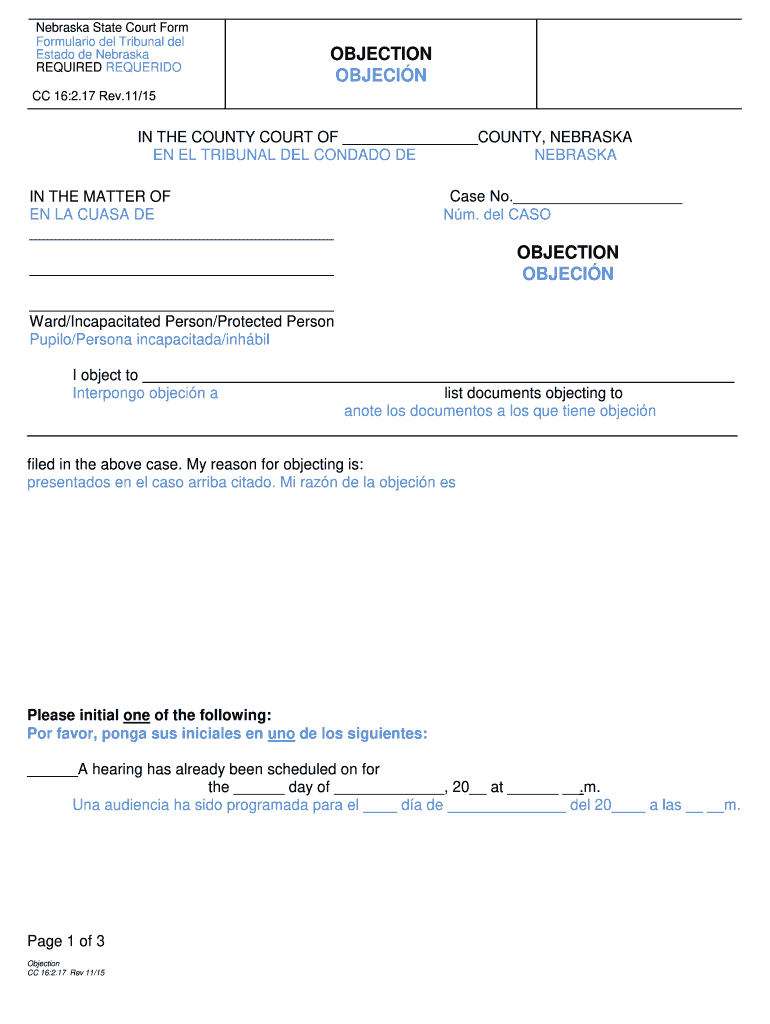 Nebraska State Court Form Formulation Del Tribunal del Est ado de Nebraska REQUIRED REQUERIDOOBJECTION OBJECTING 16:2.17 Rev.11/15IN THE COUNTY COURT OF COUNTY, NEBRASKA EN EL TRIBUNAL DEL CONRAD