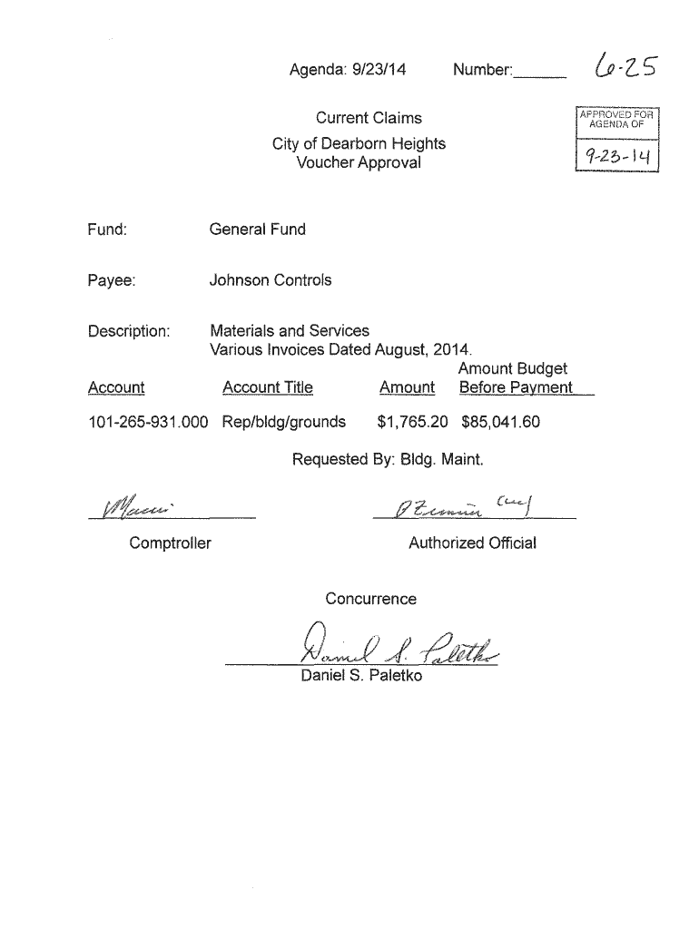 Number: Agenda: 9/23/14 Current Claims City of Dearborn Heights Voucher ApprovalFund:General Fundraise:Johnson ControlsDescription:Materials and Services Various Invoices Dated August 2014. Amount
