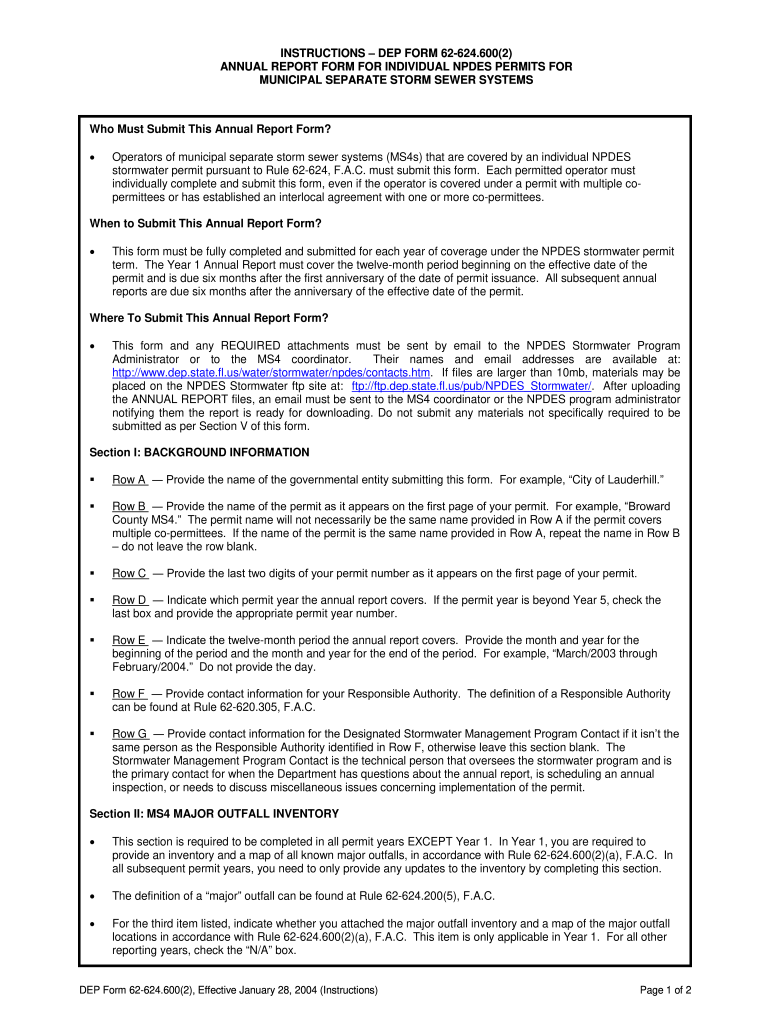 INSTRUCTIONS DEP FORM 62624,600(2) ANNUAL REPORT FORM FOR INDIVIDUAL NODES PERMITS FOR MUNICIPAL SEPARATE STORM SEWER Systems Must Submit This Annual Report Form? Operators of municipal separate storm