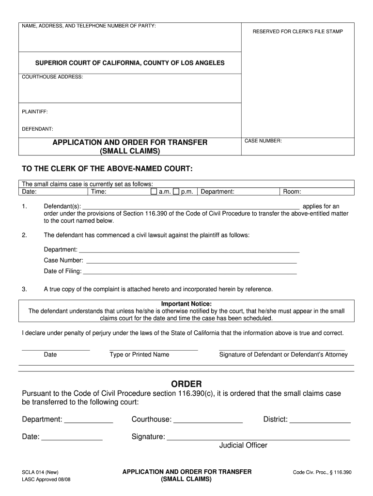 Get the free California Small Claims Transfer Application