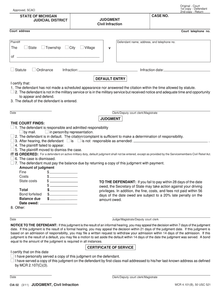 Get the free Michigan Civil Infraction Judgment
