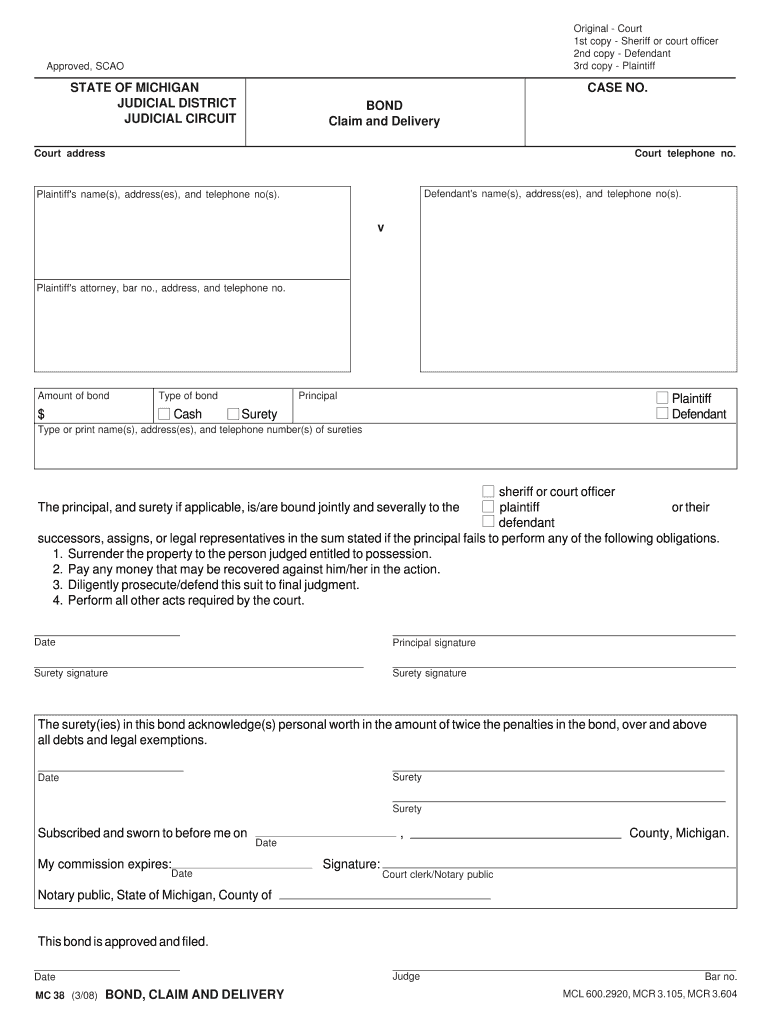 Do I need a notarization for the Michigan Claim and Delivery Bond?