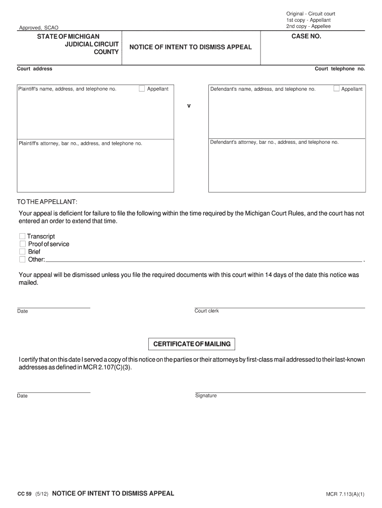 Get the free Notice of Intent to Dismiss Appeal - Michigan Courts - State of bb - courts mi