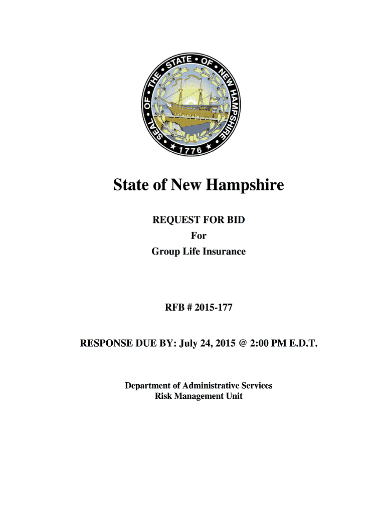 State of New Hampshire REQUEST FOR BID For Group Life Insurance # 2015177RESPONSE DUE BY: July 24, 2015 2:00 PM E.D.T. Department of Administrative Services Risk Management Unhittable of Contents