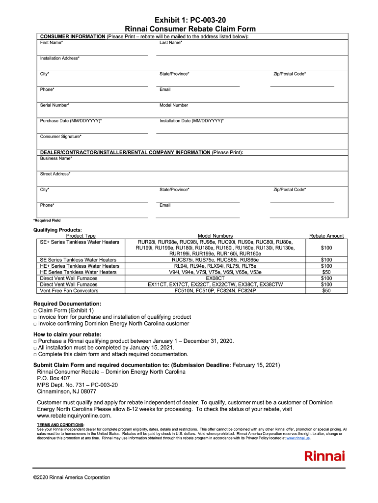 Get the free Exhibit 1: P-C-E-003-17 Rinnai Consumer Rebate Consumer ...