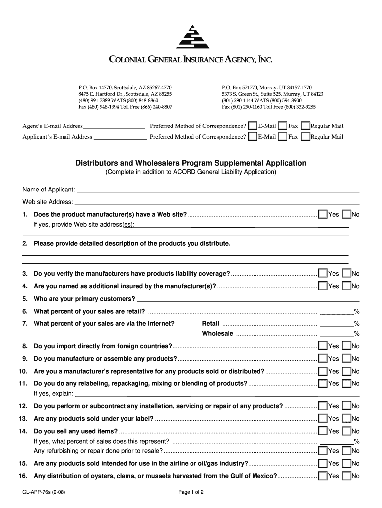 The Distributors and Wholesalers Program Supplemental Application is a business form used by distributors and wholesalers to furnish detailed information about their operations and product distribution.