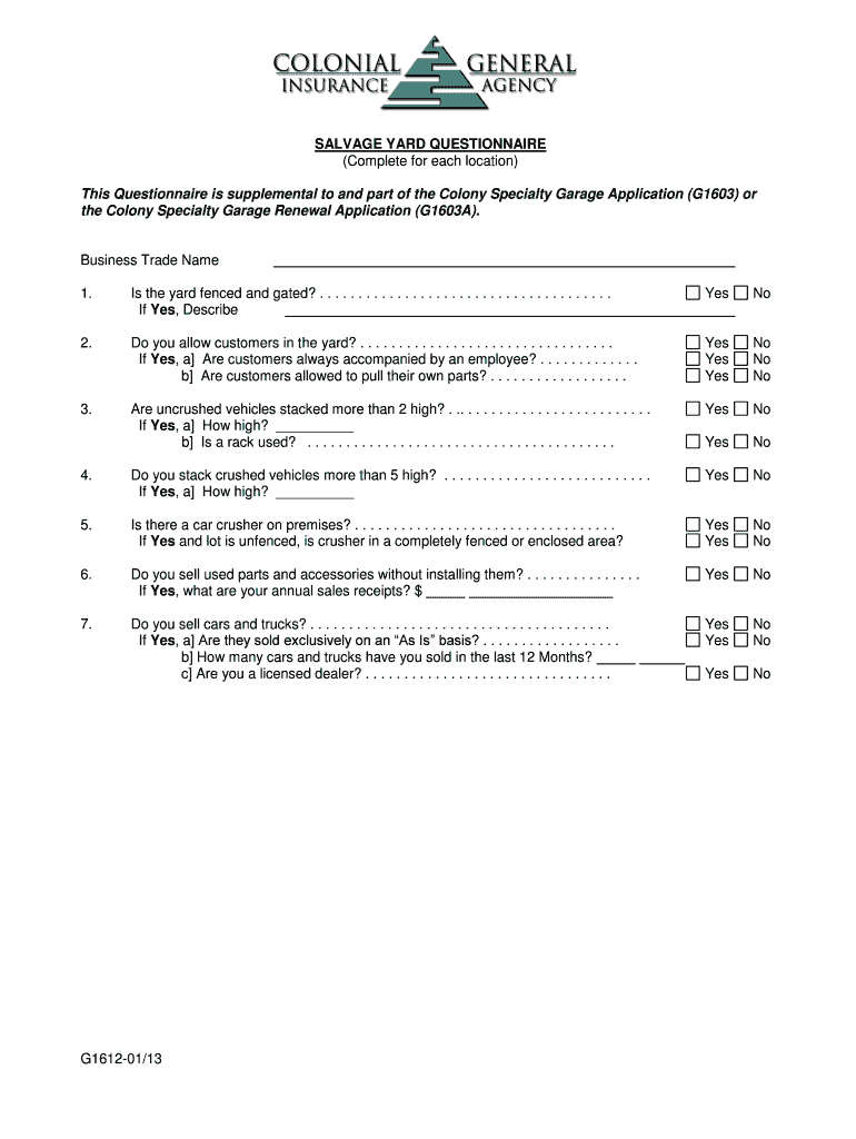 The Salvage Yard Questionnaire must be completed by salvage yard owners or operators who are applying for or renewing a license with the Colony Specialty Garage. It's also useful for regulatory authorities tracking salvage yard operations.