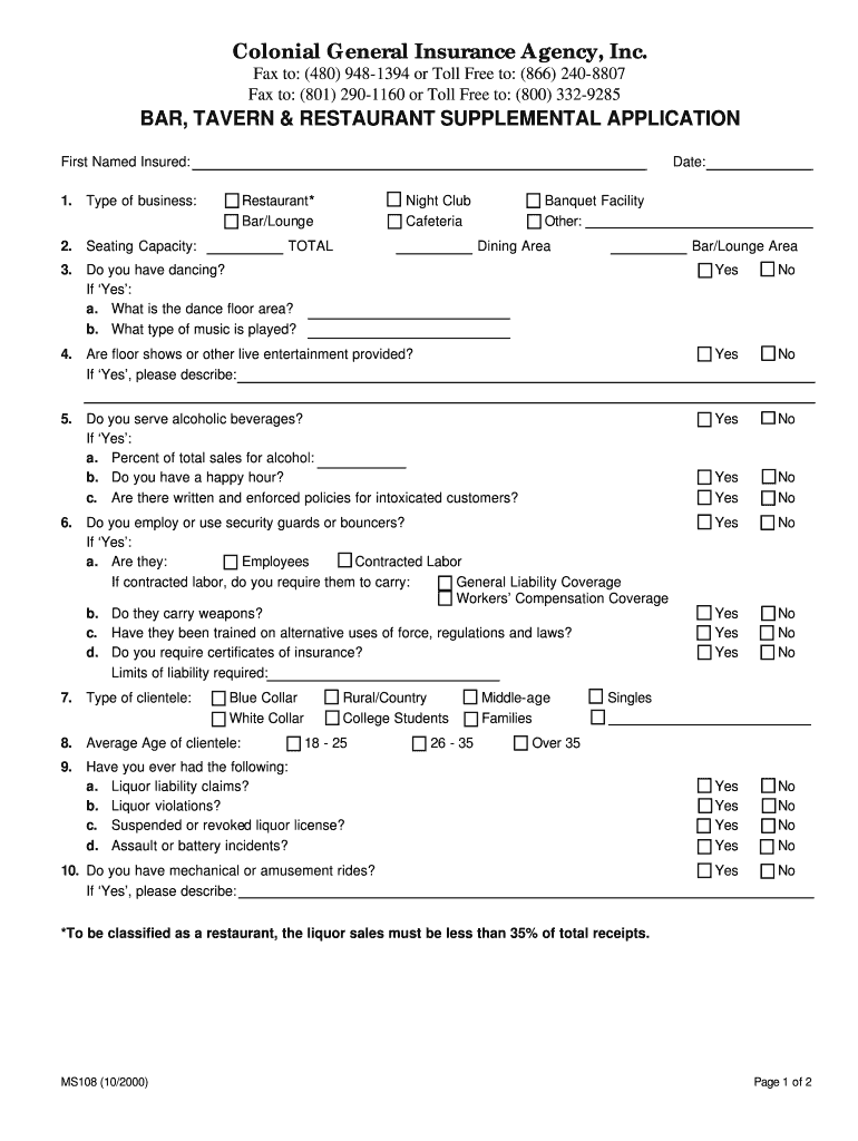 The Bar and Restaurant Insurance Application is a vital form used by business owners to acquire necessary insurance coverage tailored specifically for bars and restaurants. This application plays a crucial role in ensuring that businesses can obtain the right insurance to protect against potential risks and liabilities associated with alcohol service and general operations. Completing this application accurately is essential for securing appropriate coverage that meets the unique needs of bars and restaurants.