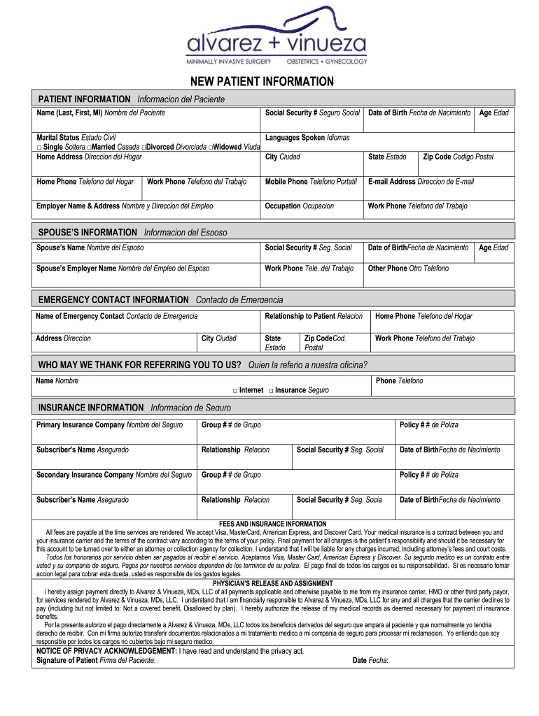 NEW PATIENT INFORMATION Del Patients Name (Last, First, MI) Hombre del PacienteSocial Security # Segura Socialite of Birth Tech de NacimientoMarital Status Est ado Civil Languages Spoken Idioms Single