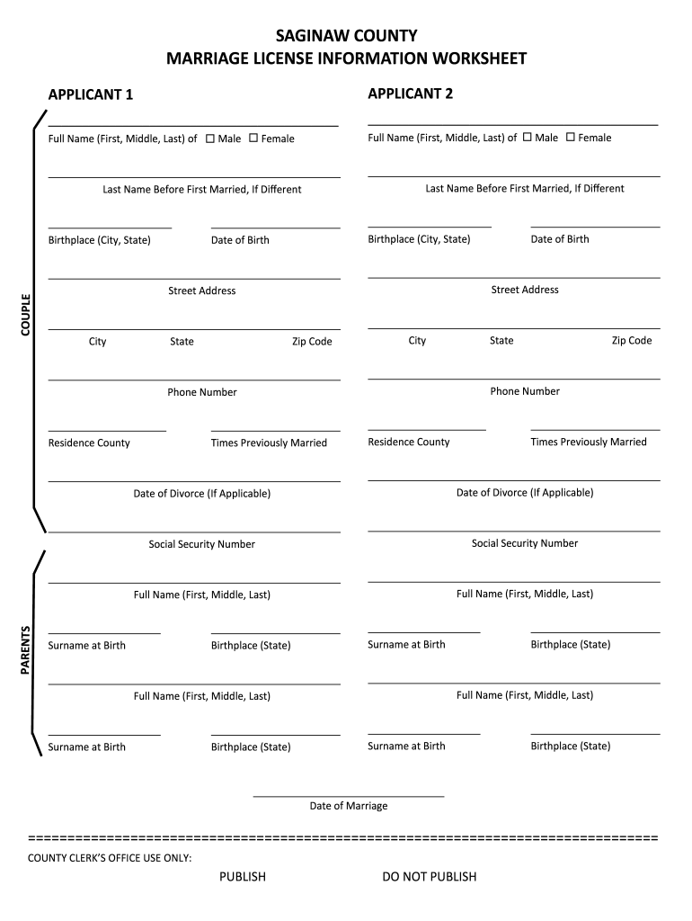 SAGINAW COUNTY MARRIAGE LICENSE INFORMATION WORKSHEET APPLICANT 1APPLICANT 2 Full Name (First, Middle, Last) full Name (First, Middle, Last) ofMaleFemaleMaleFemale Last Name Before First Married,