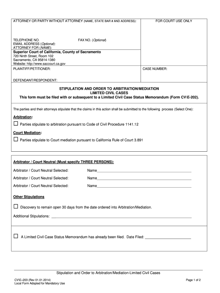 The Stipulation and Order to Arbitration/Mediation should be filed with or after the Limited Civil Case Status Memorandum (Form CV\E-202). It's best to check with the court for any specific deadlines related to your case.