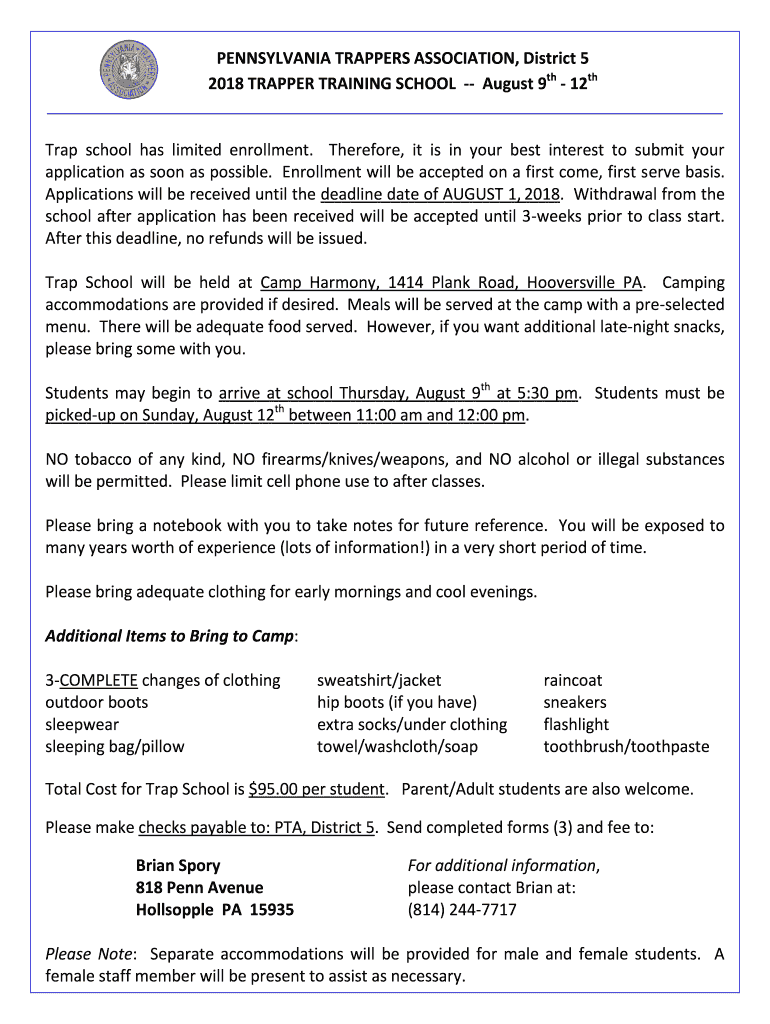 PENNSYLVANIA TRAPPERS ASSOCIATION, District 5 2018 TRAPPER TRAINING SCHOOL August 9th 12th Trap school has limited enrollment. Therefore, it is in your best interest to submit your application as
