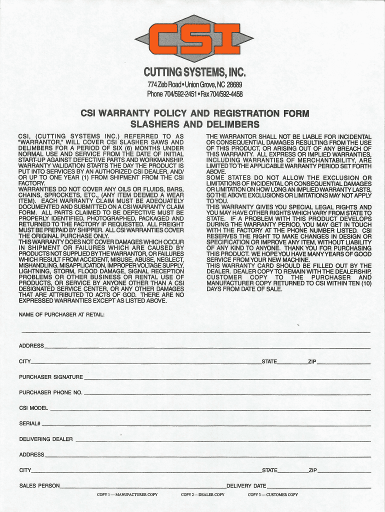 CUTTING SYSTEMS, INC. n4Zeb Road Union Grove, NC 28689 Phone 704/5922451Fax704/5924458CSI WARRANTY POLICY AND REGISTRATION FORM SLASHERS AND DELIVERS CSI, (CUTTING SYSTEMS INC.) REFERRED TO AS “WARRANT