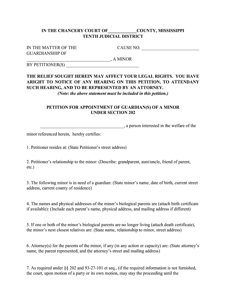 IN THE CHANCERY COURT OF COUNTY, MISSISSIPPI TENTH JUDICIAL DISTRICT IN THE MATTER OF THE CAUSE NO. GUARDIANSHIP OF, A MINOR BY PETITIONER(S) THE RELIEF SOUGHT HEREIN MAY AFFECT YOUR LEGAL RIGHTS.