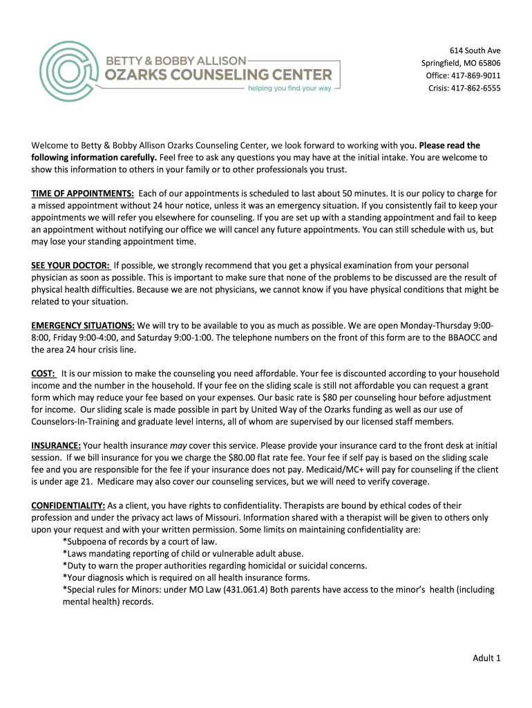 614 South Ave Springfield, MO 65806 Office: 4178699011 Crisis: 4178626555Welcome to Betty & Bobby Allison Ozarks Counseling Center, we look forward to working with you. Please read the following information