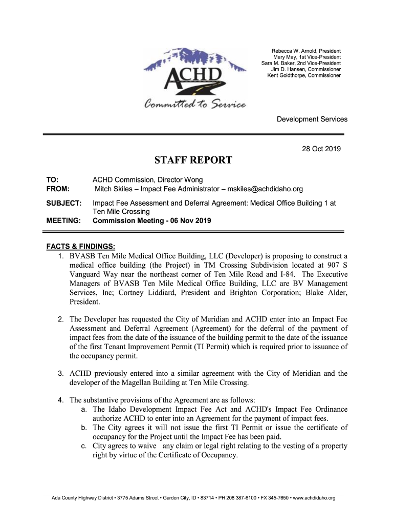 Rebecca W. Arnold, President Mary May, 1st VicePresident Sara M. Baker, 2nd VicePresident Jim D. Hansen, Commissioner Kent Goldthorpe, CommissionerDevelopment Services28 Oct 2019STAFF REPORT TO: FROM:ACID