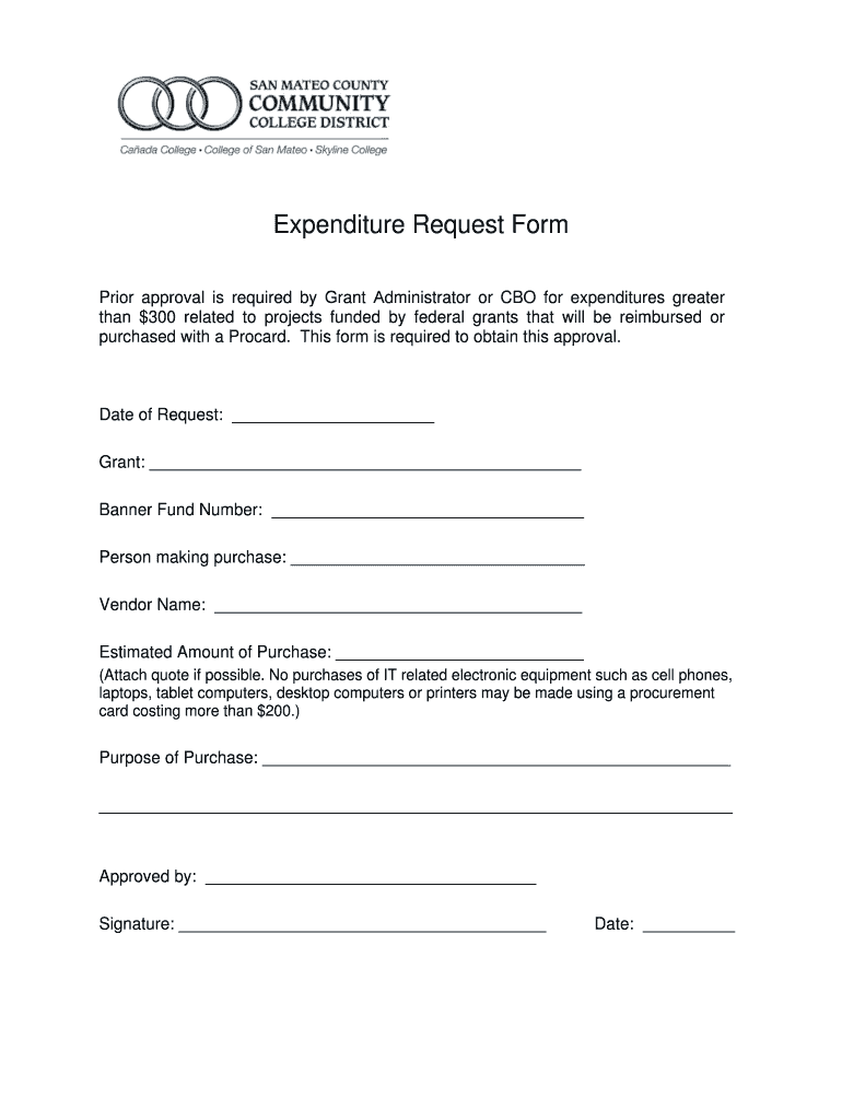 Expenditure Request Form Prior approval is required by Grant Administrator or CBO for expenditures greater than $300 related to projects funded by federal grants that will be reimbursed or purchased