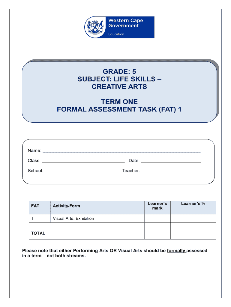 GRADE: 5 SUBJECT: LIFE SKILLS CREATIVE ARTS TERM ONE FORMAL ASSESSMENT TASK (FAT) 1Name: Class: Date: School: Activity/Form1Visual Arts: ExhibitionTeacher: Learners marketeers %TOTALPlease note that