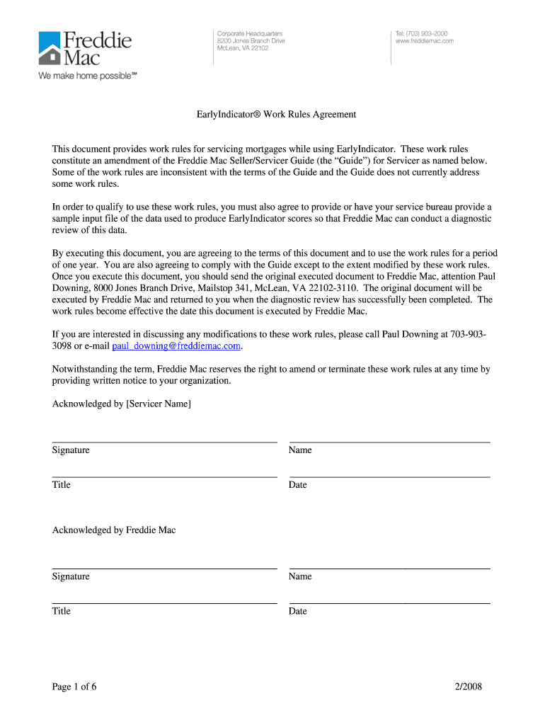 The EarlyIndicator Work Rules Agreement is a service agreement used by Freddie Mac and mortgage servicers to outline specific work rules for servicing mortgages using EarlyIndicator.