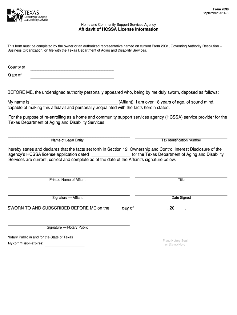 Form 2030 September 2014-E Home and Community Support Services Agency Affidavit of HCS SA License Information This form must be completed by the owner or an authorized representative named on current