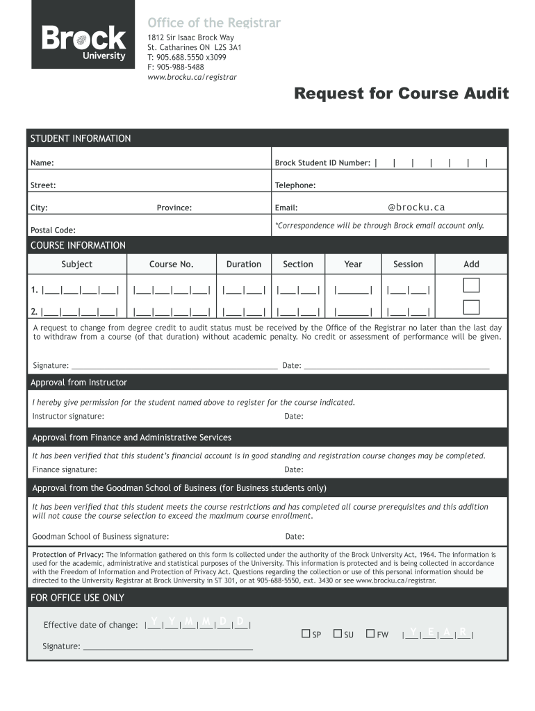 Leedleed2 leedeed1812 Sir Isaac Brock Way St. Catharines ON L2S 3A1 T: 905.688.5550 x3099 F: 9059885488 www.brocku.ca/registrarRequest for Course AuditSTUDENT INFORMATION Name:Brock Student ID Number: