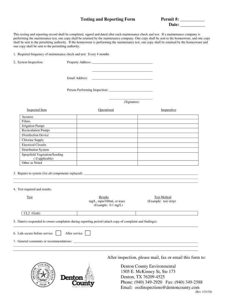 Testing and Reporting FormPermit #: Date: This testing and reporting record shall be completed, signed and dated after each maintenance check and test. If a maintenance company is performing the maintenance