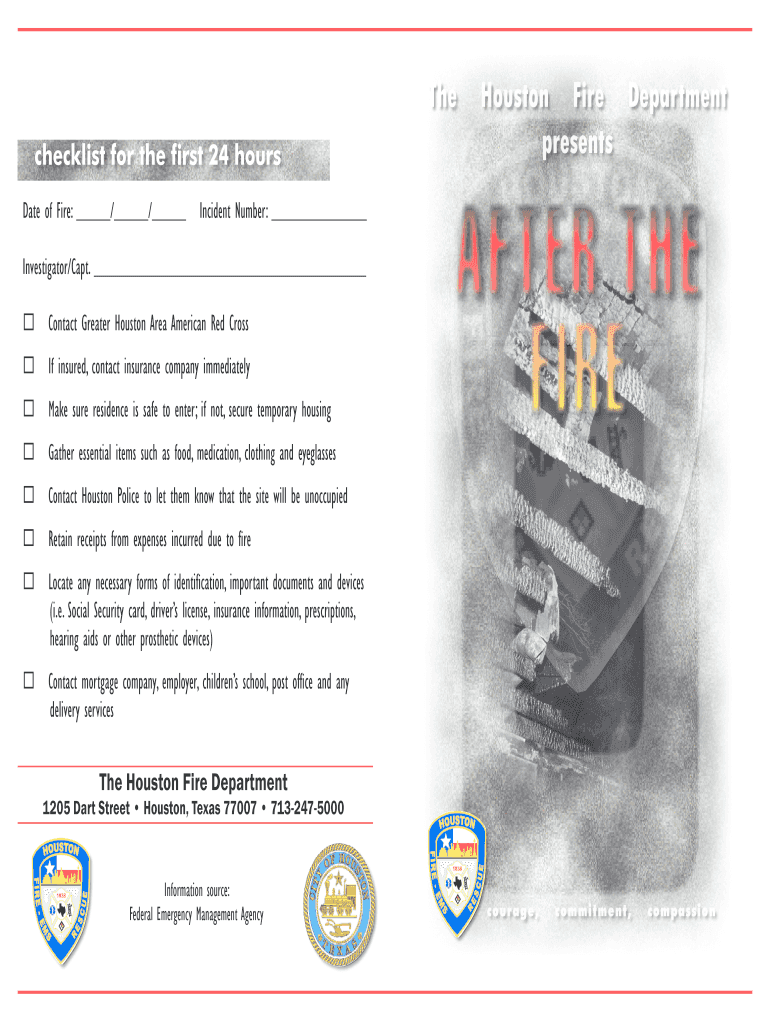 The Houston Fire Department Checklist is a document used by individuals affected by fire to organize critical tasks to complete within the first 24 hours post-fire.