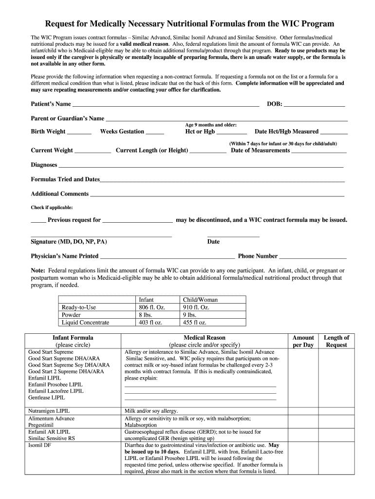 Get the free Request for Medically Necessary Nutritional Formulas from the WIC Program