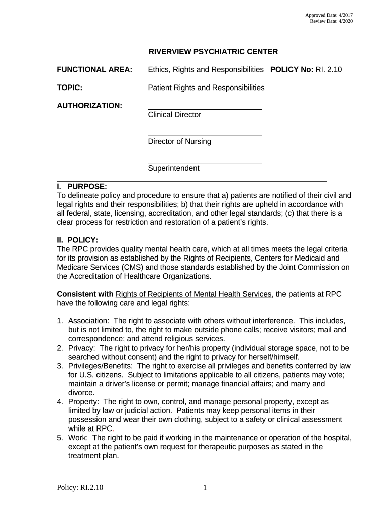 The FUNCTIONAL AREA:Ethics, Rights and ResponsibilitiesPOLICY No: RI is a fillable form in MS Word extension required to be submitted to the specific address in order to provide specific information. It has to be completed and signed, which can be done manually, or with the help of a certain solution e. g. PDFfiller. This tool lets you complete any PDF or Word document directly from your browser (no software requred), customize it depending on your requirements and put a legally-binding electronic signature. Once after completion, the user can easily send the FUNCTIONAL AREA:Ethics, Rights and ResponsibilitiesPOLICY No: RI to the appropriate receiver, or multiple ones via email or fax. The blank is printable too thanks to PDFfiller feature and options presented for printing out adjustment. In both electronic and physical appearance, your form will have got clean and professional appearance. You can also save it as the template for later, so you don't need to create a new blank form again. Just amend the ready sample.
