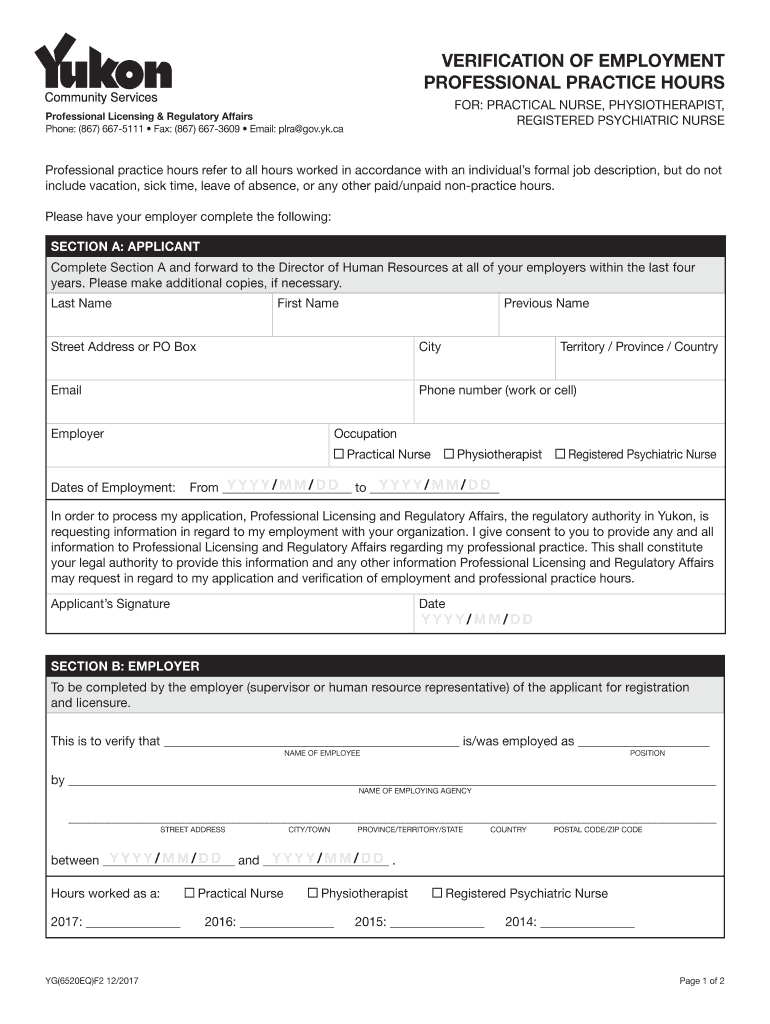 VERIFICATION OF EMPLOYMENT PROFESSIONAL PRACTICE HOURS FOR: PRACTICAL NURSE, PHYSIOTHERAPIST, REGISTERED PSYCHIATRIC Preprofessional Licensing & Regulatory Affairs Phone: (867) 6675111 Fax: (867)