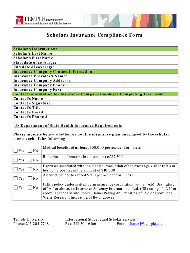 Get the free Temple University Scholars Insurance Compliance Form - temple