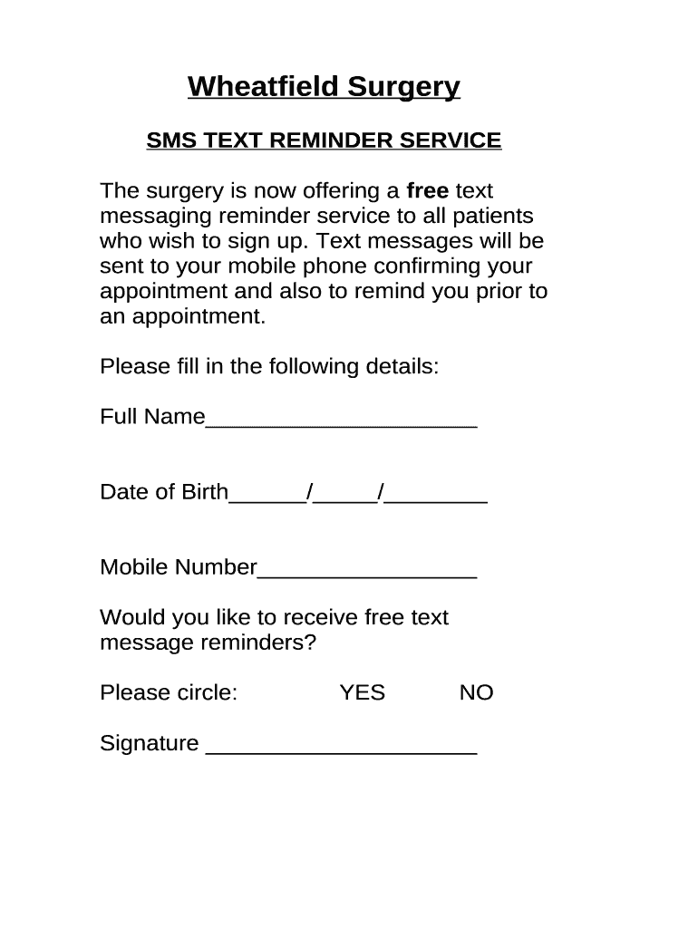 Template Wheatfield Surgery SMS TEXT REMINDER SERVICE instructions
