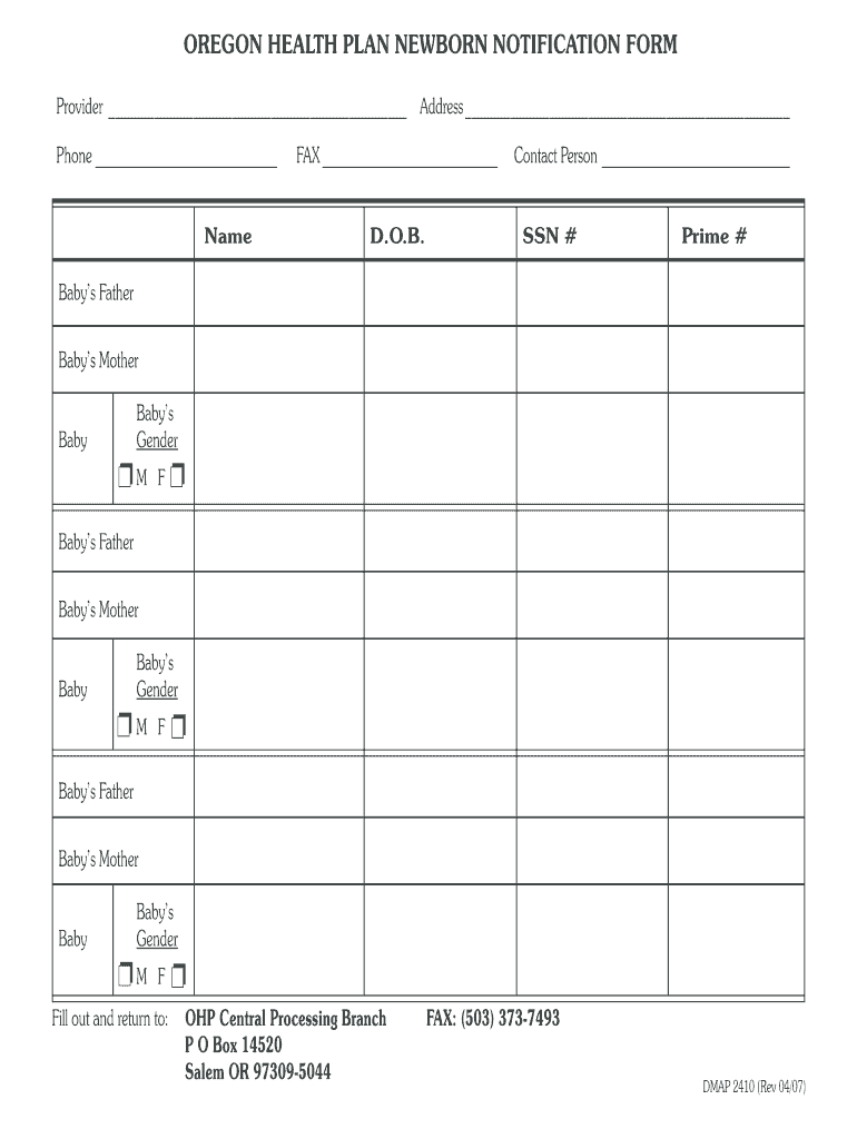 The Oregon Health Plan Newborn Notification Form (DMAP 2410) is crucial for healthcare providers in Oregon. This form serves to notify the state about newborns eligible for the Oregon Health Plan (OHP), ensuring timely enrollment in medical coverage. By filling this form, providers play a vital role in the healthcare system by facilitating access to essential services for newborns.