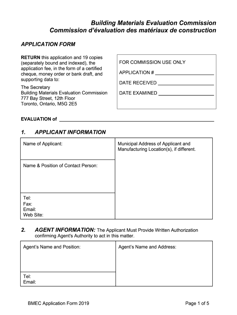 Building Materials Evaluation Commission evaluation DES matrix DE construction APPLICATION FORM RETURN this application and 19 copies (separately bound and indexed), the application fee, in the form