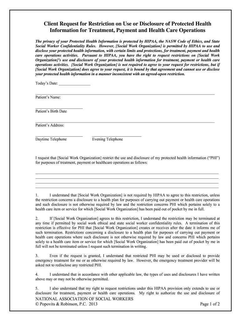 Get the free Client Request for Restriction on Use or Disclosure of ... - NASW