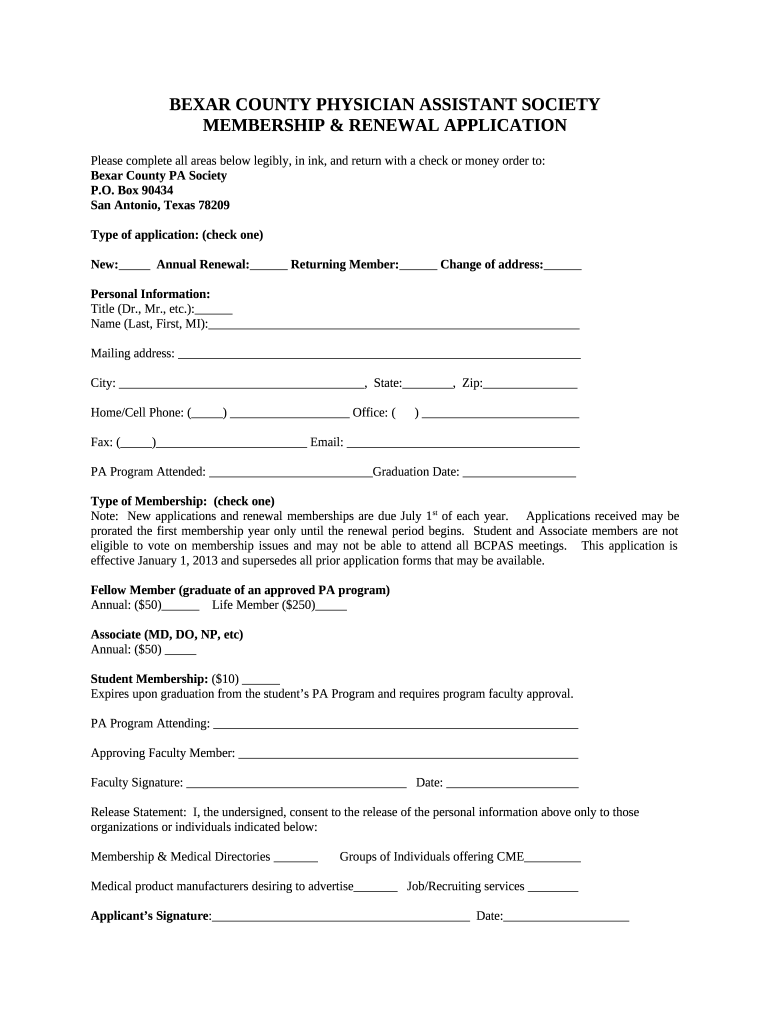 The Bexar County Physician Assistant Society - Home is a document needed to be submitted to the relevant address in order to provide specific information. It needs to be filled-out and signed, which is possible manually, or with a particular software e. g. PDFfiller. It lets you fill out any PDF or Word document directly in your browser, customize it according to your requirements and put a legally-binding electronic signature. Once after completion, the user can send the Bexar County Physician Assistant Society - Home to the relevant recipient, or multiple ones via email or fax. The editable template is printable as well because of PDFfiller feature and options offered for printing out adjustment. In both digital and in hard copy, your form will have a organized and professional appearance. You can also turn it into a template for further use, so you don't need to create a new file from the beginning. You need just to edit the ready sample.