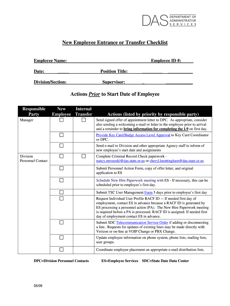 Employers should complete the New Employee Entrance or Transfer Checklist before the employee's start date and within 30 days of their hire or transfer.