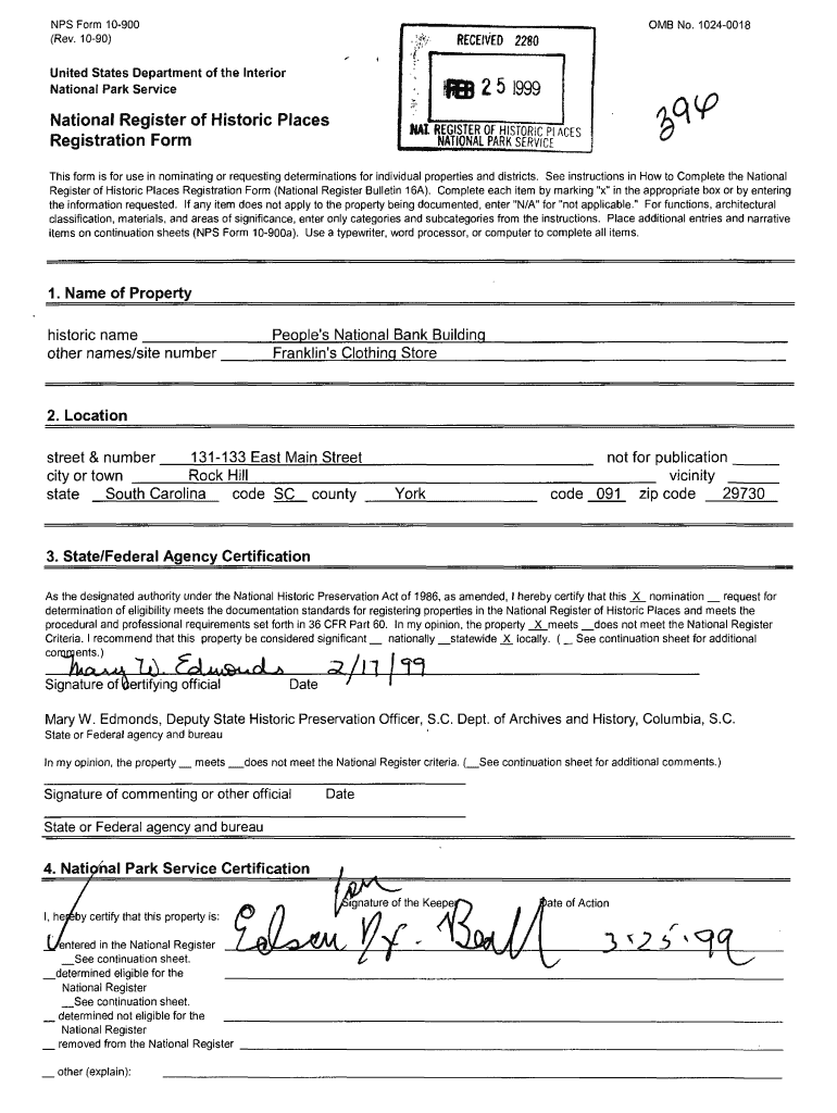 N PS Form 10900 (Rev. 1090)OMB No. 10240018, ;**/ 'United States Department of the Interior National Park ServiceRECEIVED 2280flBB 2 5 1999National Register of Historic Places Registration Format