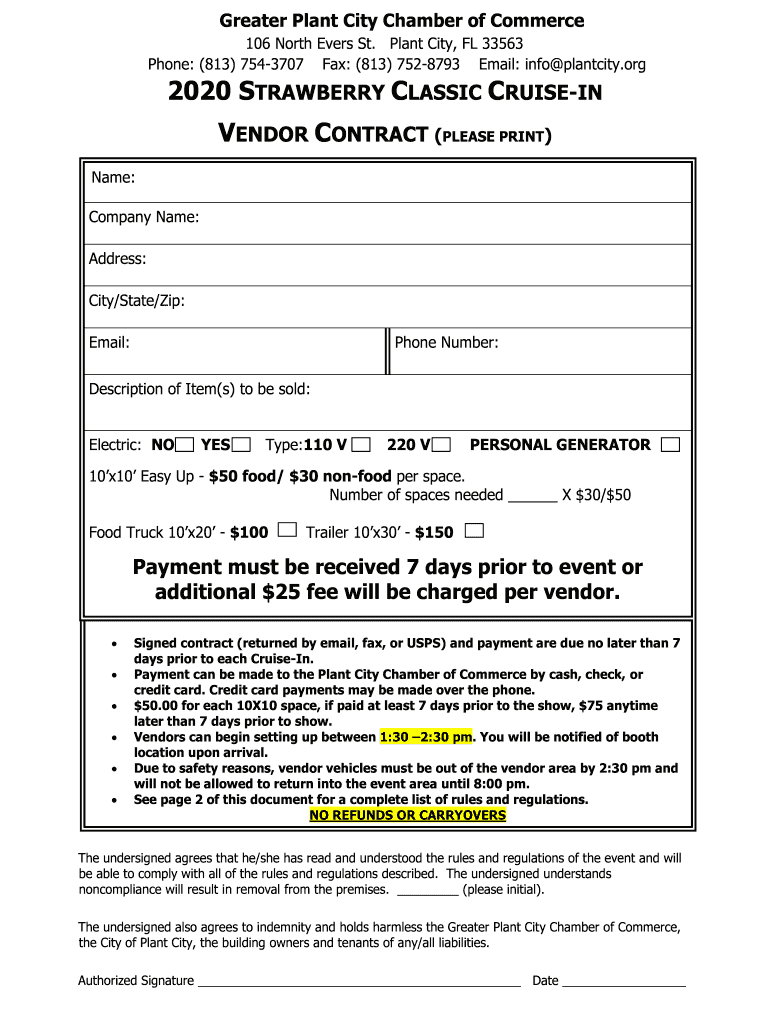 Greater Plant City Chamber of Commerce 106 North Every St. Plant City, FL 33563 Phone: (813) 7543707 Fax: (813) 7528793 Email: info Plant City.org2020 STRAWBERRY CLASSIC CRUISE IN VENDOR CONTRACT