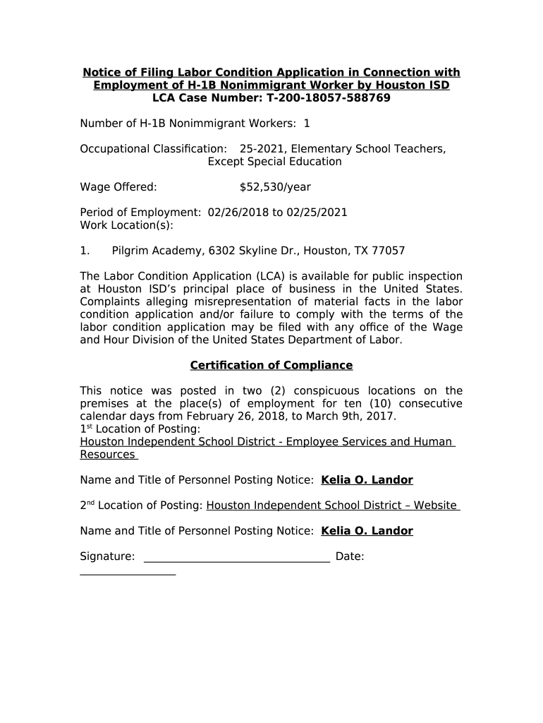 Instructions for the Notice of Filing Labor Condition Application in Connection with Employment of H-1B Nonimmigrant Worker by Enter Petitioning Employer Name form