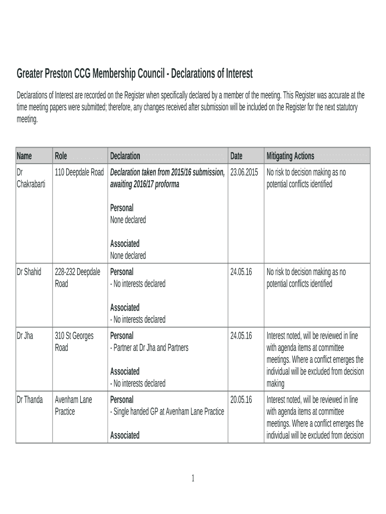 Greater Preston CCG Membership Council - Declarations of Interest template instructions