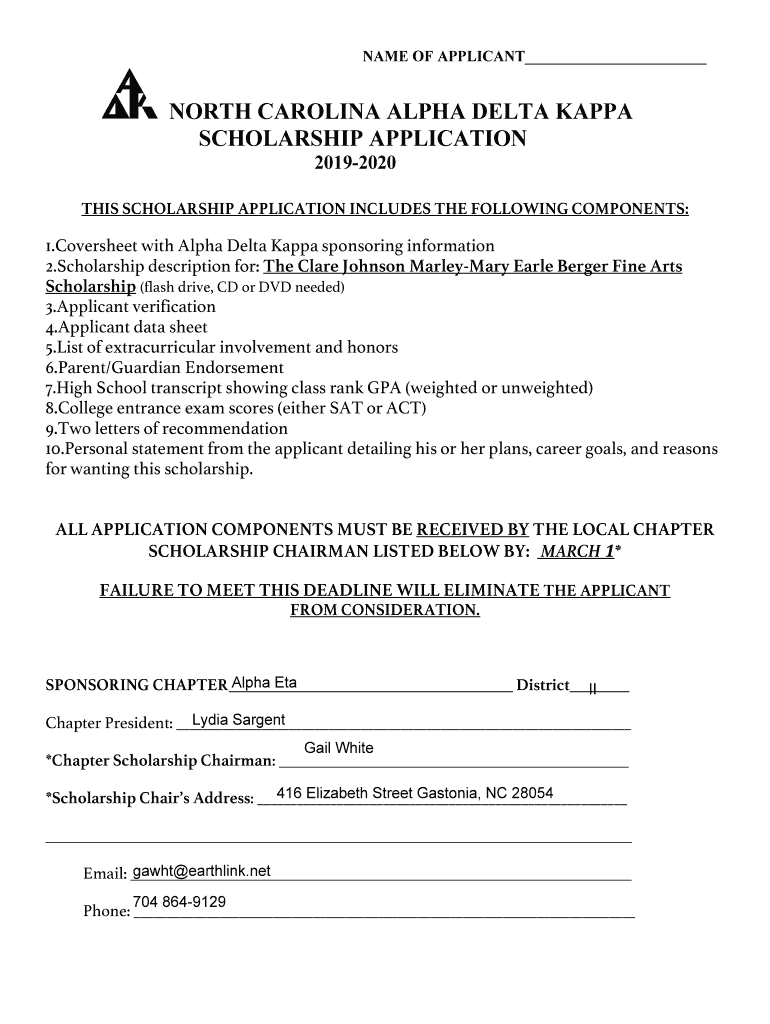 NAME OF APPLICANT NORTH CAROLINA ALPHA DELTA KAPPA SCHOLARSHIP APPLICATION 20192020 THIS SCHOLARSHIP APPLICATION INCLUDES THE FOLLOWING COMPONENTS:1. Cover sheet with Alpha Delta Kappa sponsoring