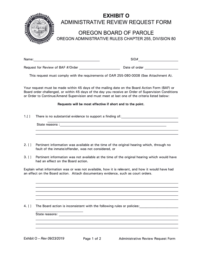 OREGON BOARD OF PAROLEOREGON ADMINISTRATIVE RULES CHAPTER 255, DIVISION 80SID#Name:Date of orderRequest for Review of BAF #/Orders request must comply