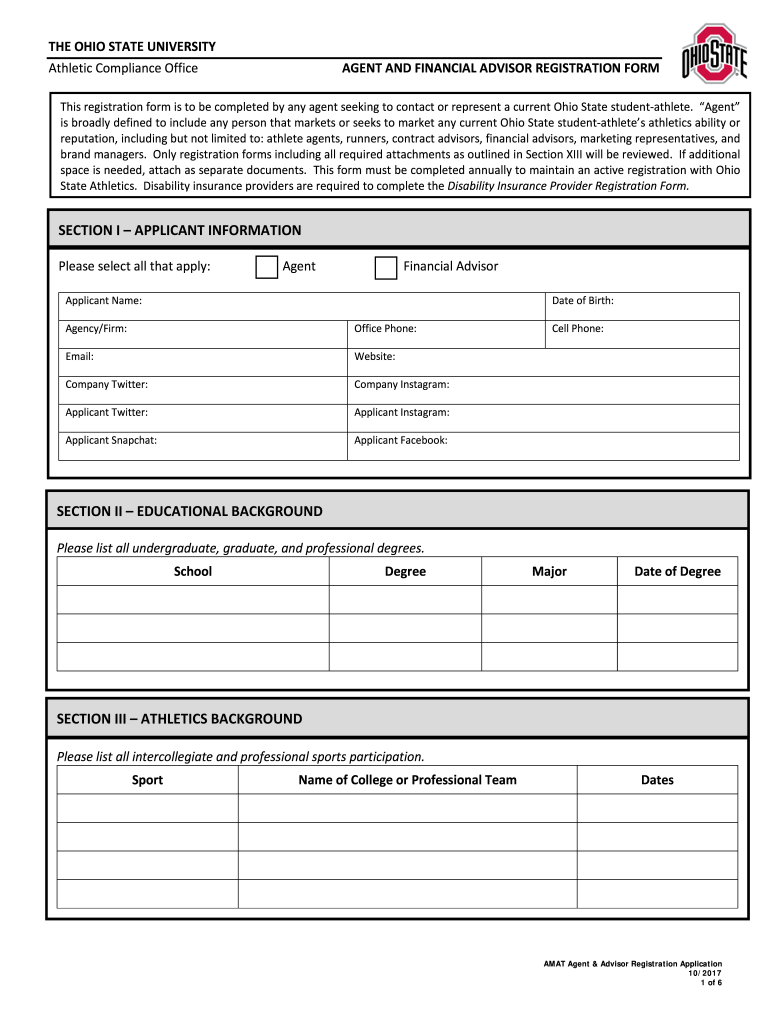 AGENT AND FINANCIAL ADVISOR REGISTRATION Nonathletic Compliance Officers registration form is to be completed by any agent seeking to contact or represent a current Ohio