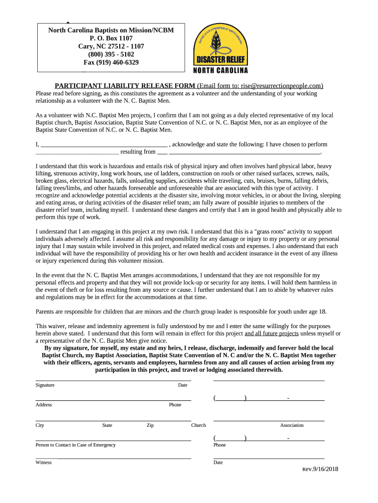 Instructions for the nc baptist men's assoc. release - Resurrection Church form