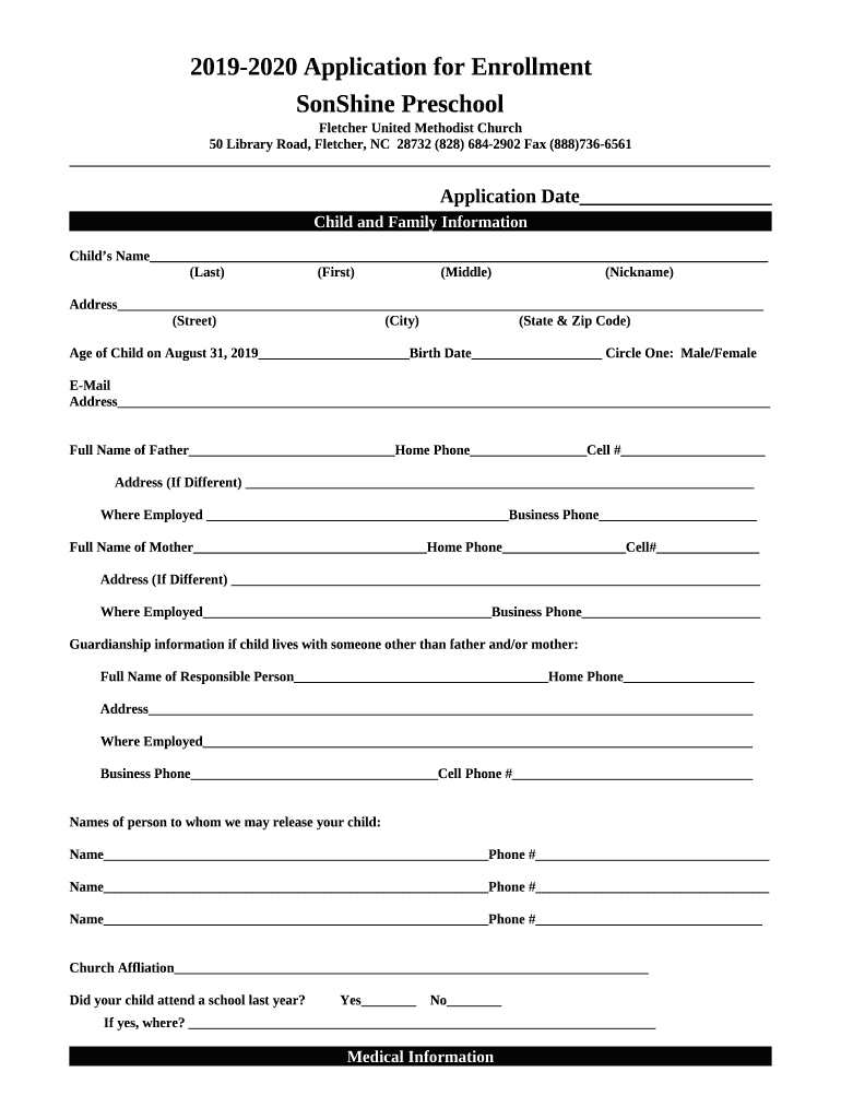 The SonShine Preschool Application is a fillable form in MS Word extension needed to be submitted to the relevant address in order to provide specific information. It must be completed and signed, which may be done manually in hard copy, or with a certain software e. g. PDFfiller. This tool helps to complete any PDF or Word document directly from your browser (no software requred), customize it according to your needs and put a legally-binding electronic signature. Right after completion, the user can send the SonShine Preschool Application to the appropriate person, or multiple individuals via email or fax. The blank is printable as well due to PDFfiller feature and options proposed for printing out adjustment. In both digital and in hard copy, your form should have a clean and professional outlook. You can also turn it into a template to use later, without creating a new blank form over and over. Just customize the ready sample.